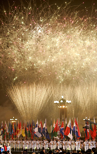 Fireworks are lit up beside the Tiananmen Gate during a ceremony to mark the one-year countdown to the Beijing Olympic Games, in Beijing August 8, 2007. The Games begin on August 8, 2008. [Reuters]