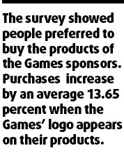 The survey showed people preferred to buy the products of the Games sponsors. Purchases increase by an average 13.65 percent when the Games'; logo appears on their products.