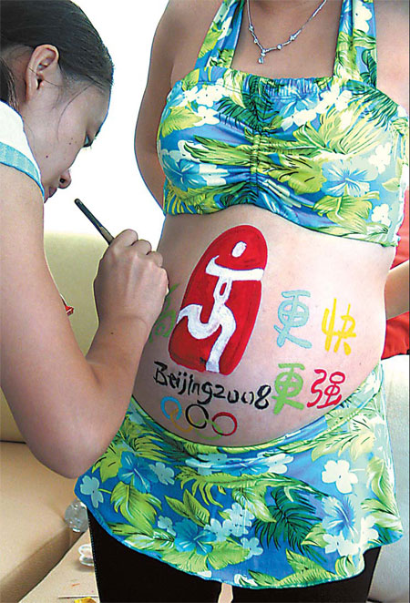 An artist paints the 2008 Beijing Games logo on the belly of a pregnant woman at an Olympic countdown event in Haikou, capital of South China's Hainan Province, yesterday.