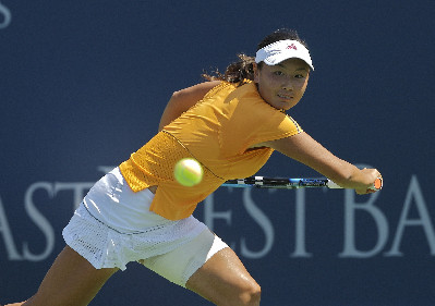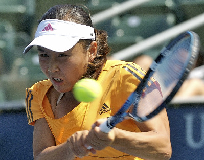 | Peng Shuai of China, returns to Jelena Jankovic of Serbia, during their match in the East West Bank Classic tennis tournament at the Home Depot Center in Carson, Calif., Wednesday, Aug. 8, 2007. [Xinhua] |