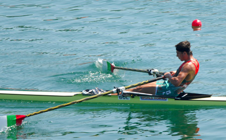 Bulgarian rower competes during men's single sculls quarterfinals at World Rowing Junior Championships, one of the "Good Luck Beijing" tests ,which was held in the newly-built Shunyi Olympic Rowing-Canoeing Park in northeastern outskirt of Beijing.[Xinhua]