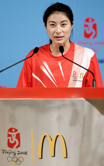 China's Olympic diving champion Guo Jingjing speaks during the McDonald's 2008 Olympic Games sponsorship platform and its newest program, McDonald's Champion Kids, in Beijing, China, Thursday, Aug. 9, 2007. The program, led by Phelps as Global Ambassador, will enable up to 300 kids from around the world to travel to the 2008 Olympic Games, meet Olympic athletes, visit cultural sights and interact with kids from across the globe. [Xinhua]