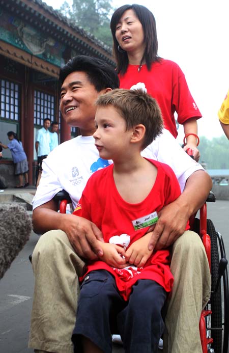 Little kid of the Germany's "Greenlink" Family (front)plays with a Chinese family in Summer Palace in Beijing August 7,2007.Ten families, five from China, and five from overseas, have won a 12-day tour of China from an "Olympic Families Tour Beijing" campain, organized by Beijing Olympic Committe (BOCOG), on the occasion of the one-year countdown to the Beijing 2008 Olympic Games.