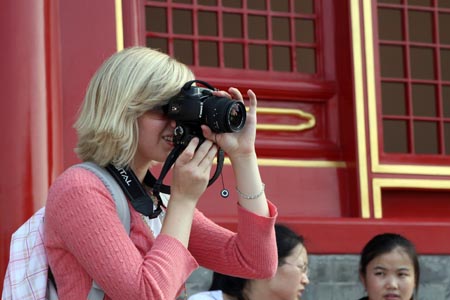 The daughter from South Africa's family named "Go to Hong Kong" takes photos in the Forbidden City in Beijing August 8,2007.Ten families, five from China, and five from overseas, have won a 12-day tour of China from an "Olympic Families Tour Beijing" campain, organized by Beijing Olympic Committe (BOCOG), on the occasion of the one-year countdown to the Beijing 2008 Olympic Games.