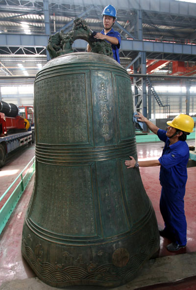 A huge Olympic bell is completed in Wuhan of central China August 8, 2007. The bell is 3.2 meters high and its diameter is 2.008 meters. It weights seven tons. An Olympic rhyme prose with 2008 Chinese characters is printed on it. [Xinhua]
