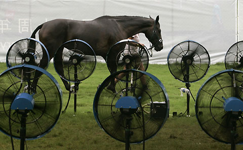 A horse is led to a misting tent for cooling after the equestrian cross country test of the eventing competition at the Hong Kong Olympic Equestrian Venue in Bea River, Hong Kong August 12, 2007. Hong Kong, famed for its world-class horse racing culture, will host Olympic equestrian events in the August 2008 Games. [Reuters]
