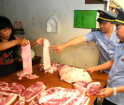 Market inspectors check licenses of pork sellers in Yinchuan, capital of northwest Ningxia Hui Autonomous Region in July 2007. [Xinhua]