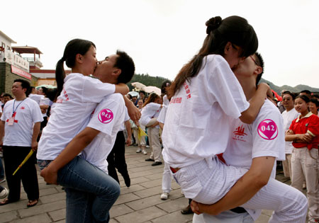 Lovers participate in a kissing contest at the foot of Huaying Mountain, Southwest China's Sichuan Province August 18, 2007 to celebrate the eve of Chinese Valentine's Day. About 150 pairs took part in the contest. The festival is called Double Seventh Festival, which falls on the 7th day of the 7th lunar month. [newsphoto]
