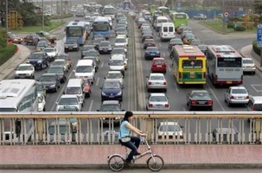 A woman rides her bicycle on the overbridge over the 2nd ring road during the rush hour in Beijing in this May 2006 file photo. [Reuters]