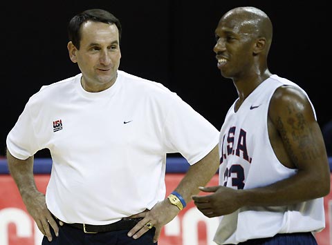 USA coach Mike Krzyzewski (L) talks to Chauncey Billups during practice for the FIBA Americas regional qualifying basketball tournament to decide two berths for the 2008 Beijing Olympics, in Las Vegas August 21, 2007. The top two teams in the tournament will qualify for the 2008 Beijing Olympics. [Reuters]