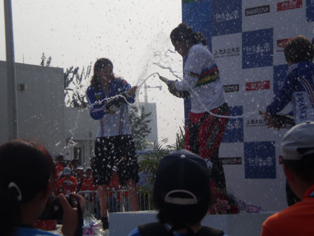 Winners of the women's BMX Supercross of the 2007 UCI BMX Supercross World Cup, one of the test events for the 2008 Olympic Games, cheer with champagne on the podium after the event at Laoshan Bicycle Moto Cross (BMX) Venue in Beijing August 21, 2007. [chinadaily.com.cn] |