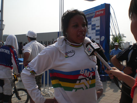 Britain's Shanaze Reade, winner of the women's BMX Supercross of the 2007 UCI BMX Supercross World Cup, one of the test events for the 2008 Olympic Games, talks to the media after the event at Laoshan Bicycle Moto Cross (BMX) Venue in Beijing August 21, 2007.[chinadaily.com.cn] |