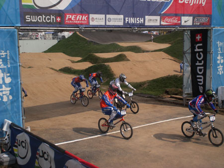 Riders cross the finish line during the men's semi-final game of the 2007 UCI BMX Supercross World Cup, one of the test events for the 2008 Olympic Games at Laoshan Bicycle Moto Cross (BMX) Venue in Beijing August 21, 2007. Donny Robinson from the United States won the final game 36.949 seconds. [chinadaily.com.cn] |