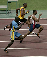 Asafa Powell of Jamaica, Tyson Gay (R) of the U.S. and Derrick Atkins (bottom) of the Bahamas run during the men's 100 metres final at the 11th IAAF World Athletics Championship in Osaka August 26, 2007. [Reuters]
