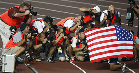 Photographers take pictures of Tyson Gay of the U.S. after he won the men's 100 metres final at the 11th IAAF World Athletics Championship in Osaka August 26, 2007. [Reuters]