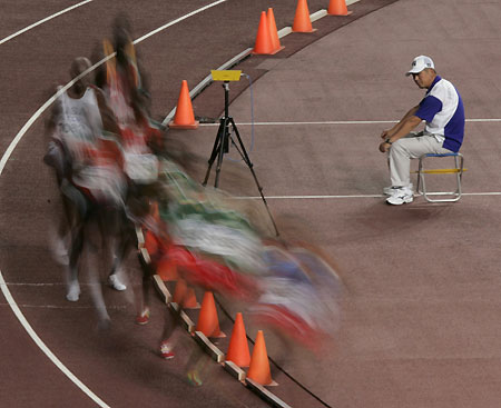 An official watches athletes compete during the men's 10,000 metres finals at the 11th IAAF World Athletics Championship in Osaka August 27, 2007. [Reuters]