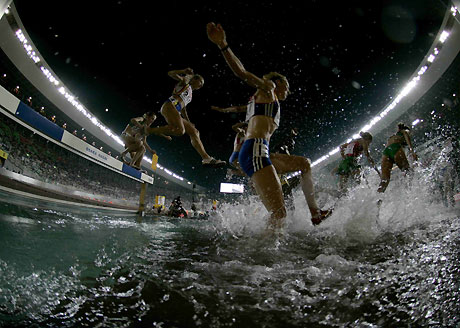 Athletes compete in the finals of the women's 3000 metres steeplechase during the 11th IAAF World Athletics Championship in Osaka August 27, 2007. Image was taken with an extreme wide angle lens. [Reuters]