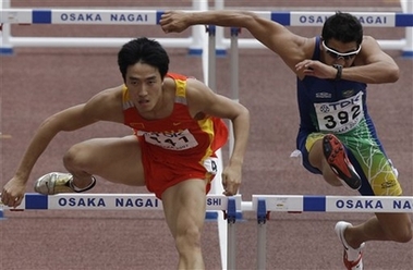 China's Liu Xiang, left, and Brazil's Anselmo da Silva compete in the Men's 110m Hurdles heats at the World Athletics Championships Wednesday, Aug. 29, 2007 in Osaka, Japan. [AP] |