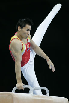 Liang Fuliang of China competes on the pommel horse during the all-around team competition at the 40th World Artistic Gymnastics Championships in Stuttgart September 3, 2007. [Reuters] |