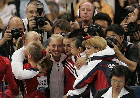 The U.S. team celebrates after winning the women's team final at the 40th World Artistic Gymnastics Championships in Stuttgart September 5, 2007. [Reuters]