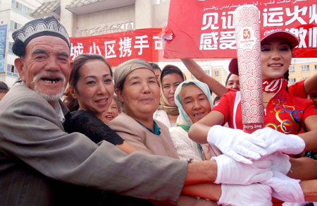 Citizens hold a torch for the Beijing Olympics during an exhibition tour to the city of Kashi (Kashgar) in Northwest China's Xinjiang Uygur Autonomous Region September 5, 2007. [Xinhua] |