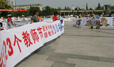 Children display a 100-meter-long stroll to mark the upcoming 23rd Teacher's Day at a square in Fuyang, East China's Anhui Province September 9, 2007. [Newsphoto]