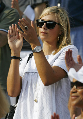 Maria Sharapova of Russia claps from Novak Djokovic's box during Djokovic's men's final of the US Open tennis tournament against Roger Federer in Flushing Meadows, New York, September 9, 2007. [Reuters] |