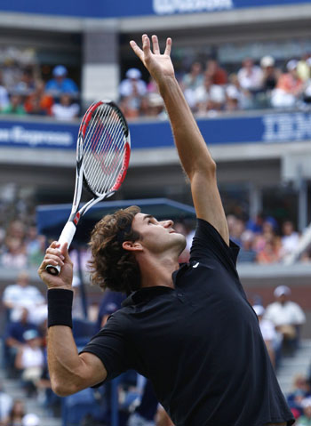 Roger Federer of Switzerland serves to Novak Djokovic of Serbia during the men's final of the US Open tennis tournament in Flushing Meadows, New York, September 9, 2007. [Reuters] |