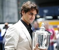 Roger Federer of Switzerland poses with the US Open trophy in New York's Times Square, September 10, 2007. [Reuters]