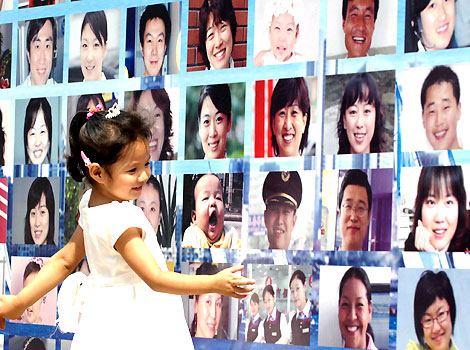 A young girl looks at a wall featuring 2008 smiling faces in Qingdao, East China's Shandong Province on September 10, 2007. The display was set up to express the city's best wishes for the 2008 Olympic Games. One of China's six co-hosting cities for the Games, Qingdao will hold the Sailing Competition in 2008. [Xinhua]