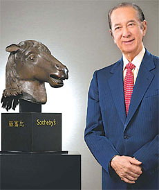This handout picture received yesterday from Sotheby's auction house shows Macao casino mogul Stanley Ho standing next to the Bronze Horse Head he recently purchased for $8.84 million in Hong Kong. [AFP]
