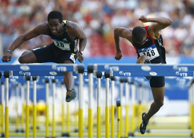 Dayron Robles of Cuba (L) runs next to Terrence Trammell of the US to win in the men's 110 metres hurdles event at the IAAF 5th World Athletics Final 2007 in Stuttgart, September 23, 2007. [Reuters] |