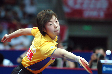 Zhang Yining returns the ball to her compatriot during the women's singles final at the Asian Table Tennis championships. Zhang win first. [Xinhua]