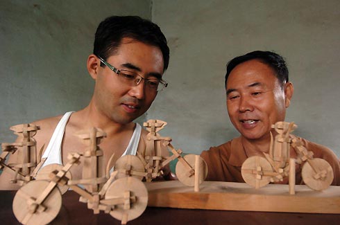 Sha Yingkui (R), a Tianjin-based craftsman, watches wooden rats on bike with his son on September 26, 2007. Sha made a set of rat dolls practicing all the Olympic sports without using nails or glue. [Xinhua]