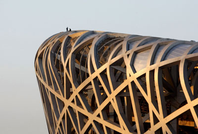 Workers install the outside transparent membrane on the top of the National Olympic Stadium, also known as the Bird's Nest, in Beijing September 29, 2007. [Agencies] |