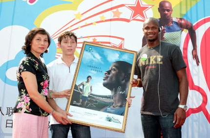 Jamaica's 100m world record holder Asafa Powell (R) presents an autographed poster to special athlete Xu Chuang (C) and his mother, September 27, 2007. Xu's mother Bao Meiqin recently published a book about her intellectually disabled son, hoping to share her experiences with parents in the same situation around the world.[Xinhua]