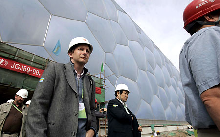 Overseas journalists tour the site of the National Aquatics Center, or Water Cube, the venue for the Olympic aquatic events, September 10, 2007. The delegates to the 2nd World Press Briefing of the 2008 Olympic Games visited the sites of the Olympic venues and the Main Press Center (MPC) on Wednesday, September 10, 2007. [Xinhua] |