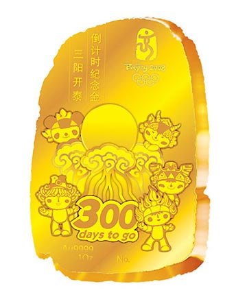 The new official licensed product of gold-madeChinese Seal with the Fuwa mascotsis seen in this photo issued by the Beijing Organizing Committee for the Games of the XXIX Olympiad (BOCOG), October 12, 2007. In celebration of the 300-day countdown to the Beijing Olympic Games,BOCOG issued 11 kinds of limited edition products in three categories, namely, insignias, badges and gold-made or silver-made souvenirs. [BOCOG]
