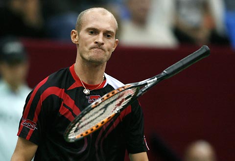 Russia's Nikolay Davydenko reacts during his Kremlin Cup final tennis match against France's Paul-Henri Mathieu in Moscow October 14, 2007. [Agencies]