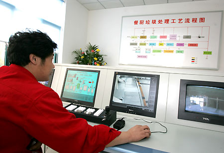 A worker oversees the food waste treatment procedure, October 17, 2007. The new plant, capable of handling 200 tons of daily food waste, is expected to serve the capital's 122 Olympic partner restaurants and 31 Olympic venues and facilities. After treatment, some waste can be converted to reusable materials for commercial use, such as fertilizer. [newsphoto]