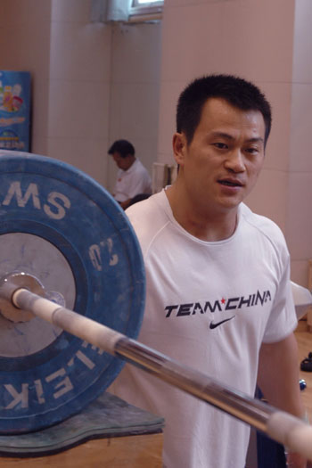 Olympic gold medallist Zhang Guozheng stands besides a barbell during a training session in a weightlifting hall of General Administration of Sports of China in this file photo dated July 17, 2007. It is highly anticipated that China's first 2008 gold medal will be from weightlifting events. [newsphoto]