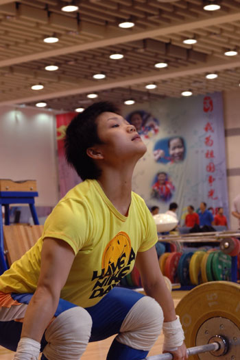 Yang Lian, 2006 World Champion prepares to lift a barbell during a training session in a weightlifting hall of General Administration of Sports of China in this file photo dated July 17, 2007. It is highly anticipated that Yang will give China its first gold medal in the 2008 Olympic Games. [newsphoto]
