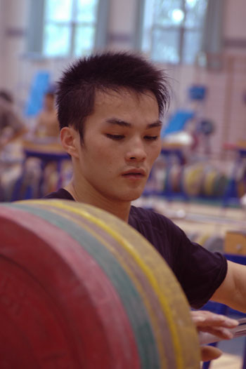 Two-time World Champion Qiu Le rests during a training session in a weightlifting hall of General Administration of Sports of China in this file photo dated July 17, 2007. It is expected that Qiu will have a good chance of winning gold in the 2008 Olympic men's weightlifting event. [newsphoto]