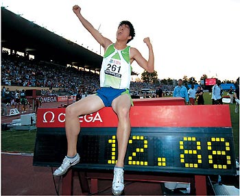 Hurdler Liu Xiang celebrates his world record time in Lausanne, Switzerland, on July 11, 2006. [Getty images]