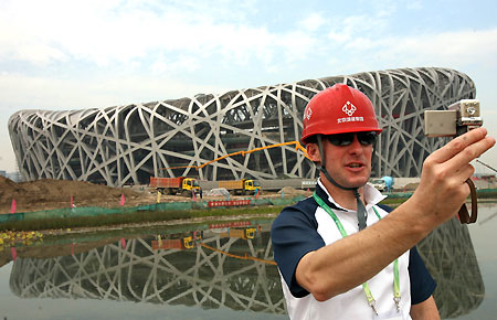An overseas reporter takes a picture of himself in front of the construction site of the National Olympic Stadium, also known as the Bird's Nest, September 10, 2007. Foreign publications will be accessible to foreign participants at the Olympic Games in 2008, Liu Binjie, minister of the General Administration of Press and Publication, has said. [Xinhua] |