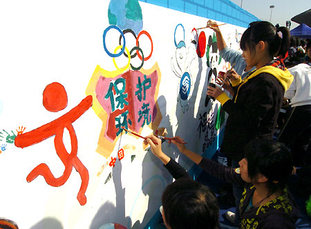 Students paint Olympic-themed graffiti at the "Environment-friendly Olympics" event at the Tianjin Olympic Sports Center square, Tianjin, October 20, 2007. Nearly 200 middle school students made handprints and green messages to raise people's awareness of protecting the environment during the 2008 Games. [Xinhua]