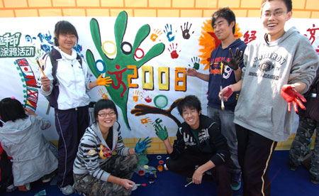 Students pose in front of the graffiti they made during an event promoting "Environment-friendly Olympics" at the Tianjin Olympic Sports Center square, Tianjin, October 20, 2007. Nearly 200 middle school students created the public artwork to raise the people's awareness of environmental protecting during the 2008 Summer Games. [Xinhua]