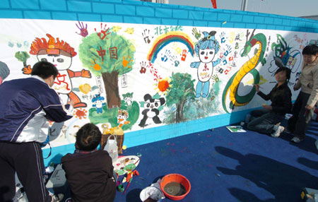 Students add finishing touches to their Olympic-themed graffiti at the "Environment-friendly Olympics" event in the Tianjin Olympic Sports Center square, Tianjin, October 20, 2007. Nearly 200 middle school students make green handprints to raise people's awareness of protecting the environment during the 2008 Summer Games. [Xinhua]