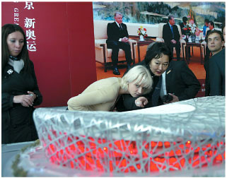 Svetlana Khorkina (second from left) and other members of the Russian Olympic champions delegation look at a model for the National Stadium at the Beijing 2008 Project Exhibition Center. [China Daily]