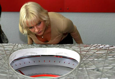 Svetlana Khorkina views a model for the National Stadium at the Beijing 2008 Project Exhibition Center, October 24, 2007. [qq.com]